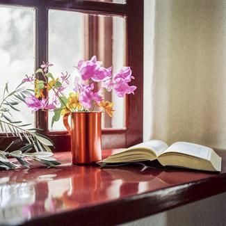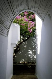Coming into the house one immediately sees the kitchen with a ceiling made of reed and cypress wood and a frieze made out of little patterned tiles. The living and sleeping area is just around the corner. There are two brick-built single beds forming an angle, a coffee table, a fire place, a wardrobe, and a small bookshelf.