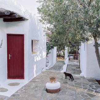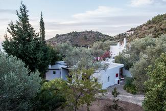 From the main room of the house, one can walk through a glass door to reach the terrace with its barbecue and reed-made arched alley. This terrace is secluded and integrates an olive tree. The enjoyable outlook consists of Mediterranean plants and the massive mountain of Kerkis with all its changing shades of grey.